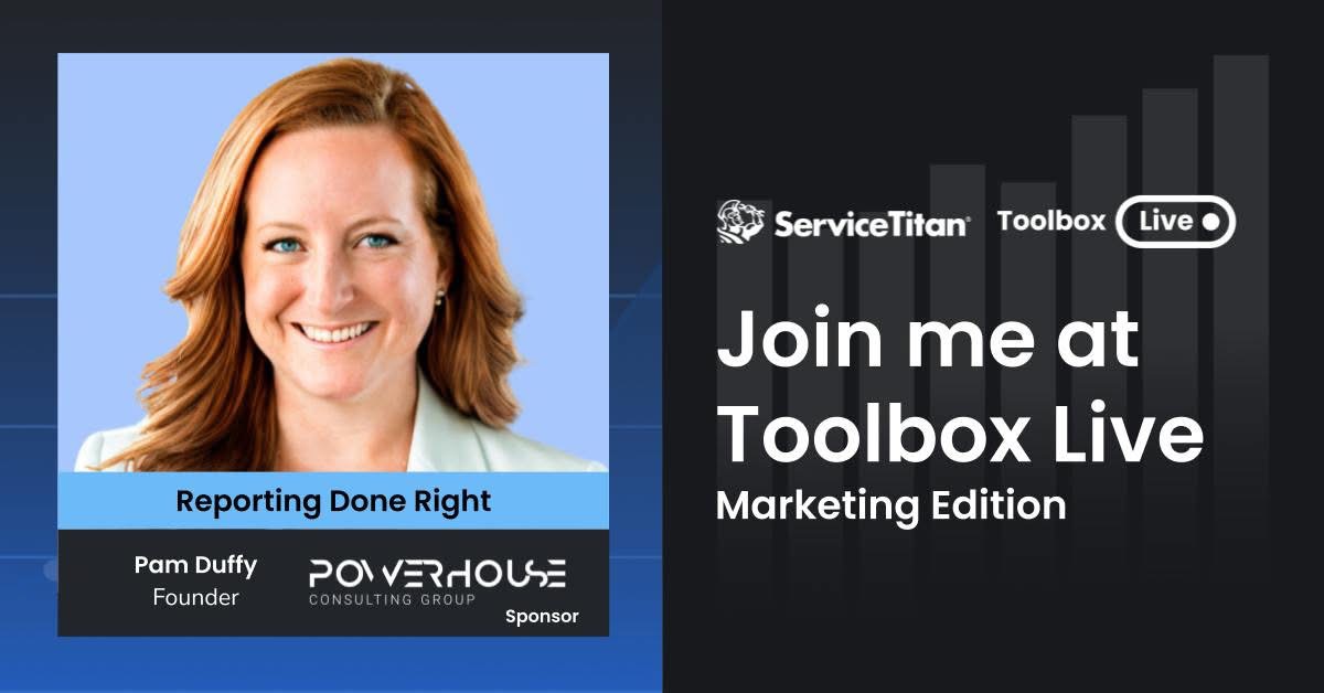 We’re thrilled to kick things off with Pam’s session- Reporting Done Right: A Guide for Marketing Reporting Success in ServiceTitan – on Thursday morning! Powerhouse Consulting Group is a proud sponsor of Toolbox Live.